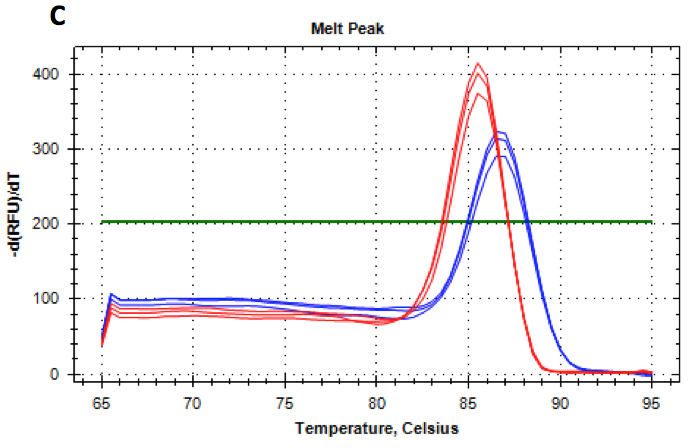 图1. 使用BlazeTaq? One-Step SYBR? Green RT-qPCR kit,对HeLa细胞RNA提取物中GAPDH和Actin水平进行分析,RNA提取物以10倍梯度稀释成7个样本,总量的范围为100 ng至0.1 pg,并设无模板对照(NTC组)。 A.GAPDH的扩增曲线(红色); B.Actin的扩增曲线(蓝色); C.GAPDH(红色)和Actin(蓝色)扩增片段的熔解曲线。