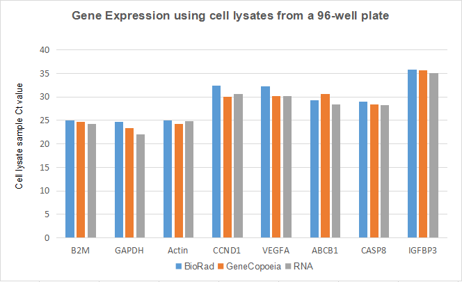 图四:在96孔板中使用细胞裂解液进行多基因检测。将3000 – 5000个HEK293细胞接种在96孔板中培养,至细胞达到70% – 90%的丰度。分别使用GeneCopoeia、BioRad的裂解液以及RNA提取试剂按使用说明处理等量细胞,使用一步法RT-qPCR试剂,检测8个基因的表达。