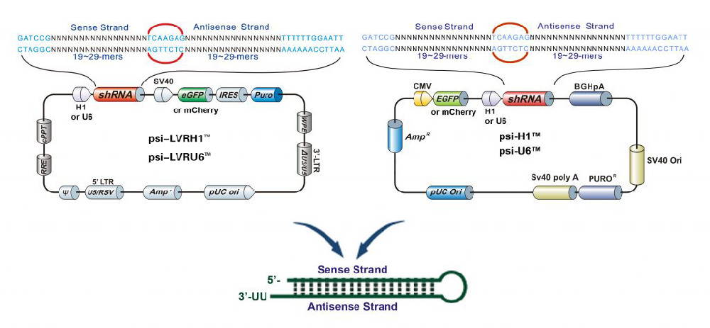 复能基因提供病毒和非病毒载体的人、小鼠和大鼠全基因组OmicsLink? shRNA表达克隆,shRNA序列经专利算法设计包括茎(19-29对核苷酸)和环,确保高效的抑制作用和最低的脱靶效应。