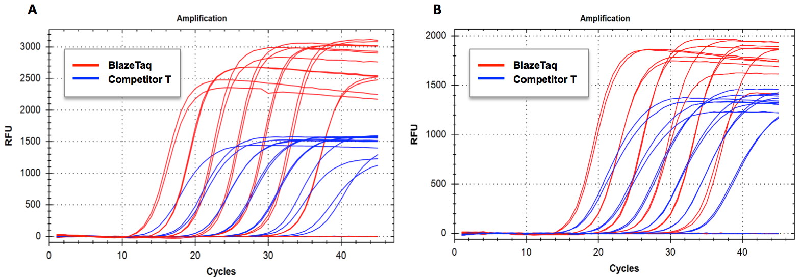 图2. BlazeTaq? One-Step SYBR? Green RT-qPCR kit(红色)与Competitor T试剂盒(蓝色)产品的性能比较。对HeLa细胞RNA提取物中GAPDH和Actin水平进行分析,RNA提取物以10倍梯度稀释成7个样本,总量的范围为100 ng至0.1 pg。 A.HeLa细胞提取物中GAPDH扩增曲线的比较; B.HeLa细胞提取物中Actin扩增曲线的比较。